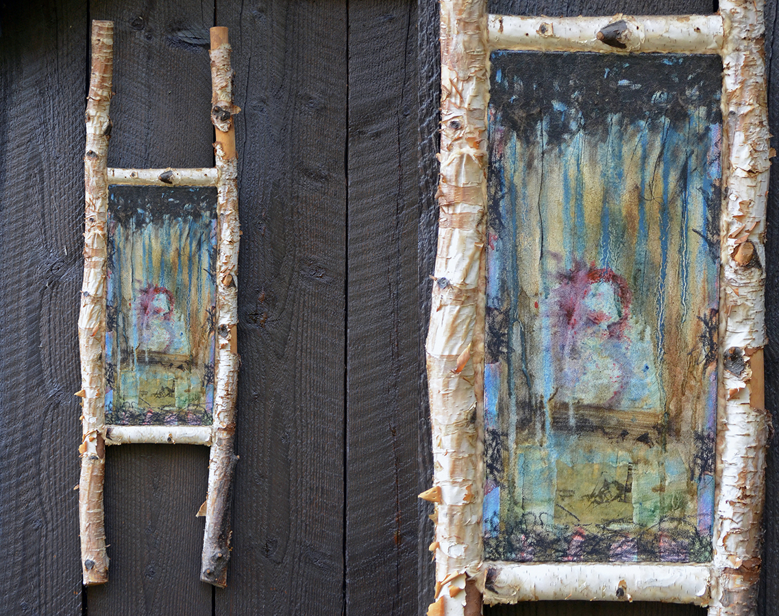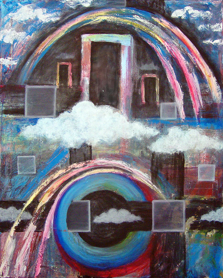And so, with the completion of the Tunnel book in 2002, and the subsequent completion of the third and final original triptych panel as “Picture Haven” in 2007, along with the numerous interactions in between, Rx completed that stage of their transformation of style and intent, and this is reflected in their work of the subsequent decade. Currently, they have endeavoured to find the time and interest to engage in various printmaking techniques again. They also returned to and completed a large collage based mixed media work that is composed on one of two structures built in 1999. The first was completed as “Poem of the Sky” in 1999, and was entirely collage based. It was intended that the second structure be completed as a companion to the first, but it stayed on the periphery as Tunnel developed, hanging blank on the studio wall, considered from time to time, ultimately taking 18 years to return to. For years it had the working title “Poem of the Cloud” but upon completion was titled “The Sky Fall”. It is another visual documental consideration of Rx’s transition of approach over time, a summation of a sort, but also indicative of new transitions coming into play yet again.