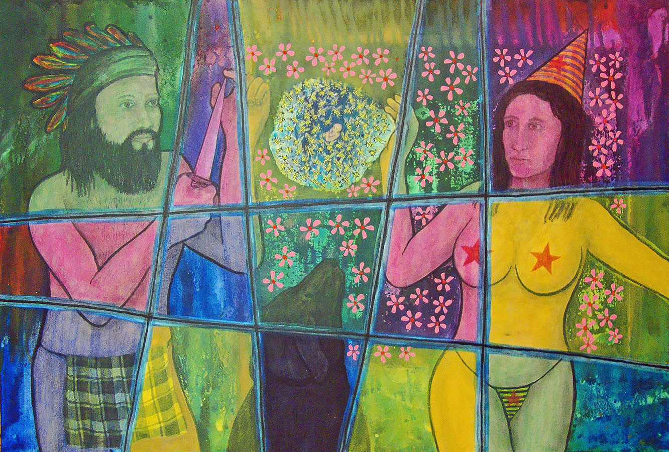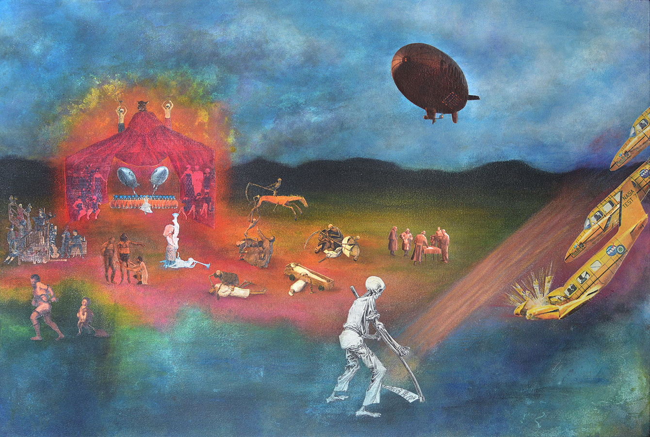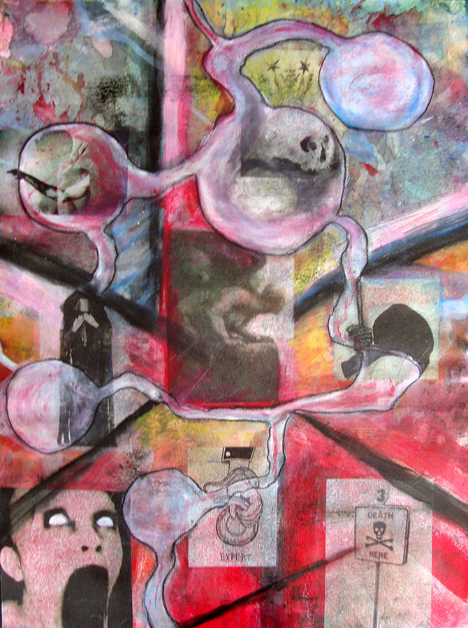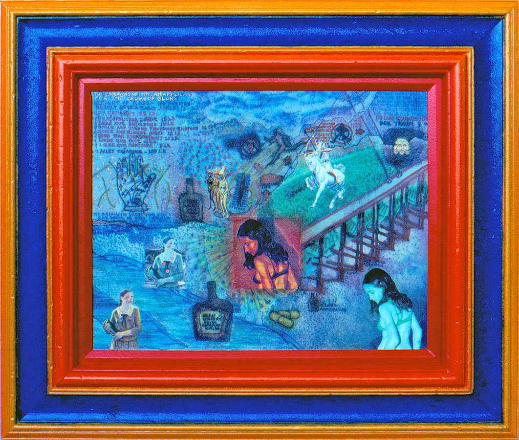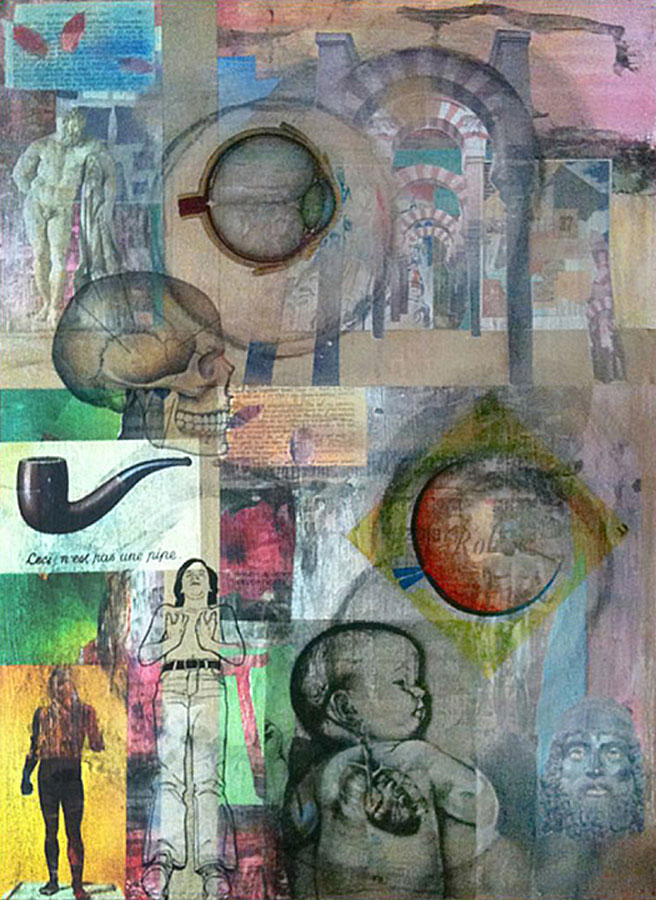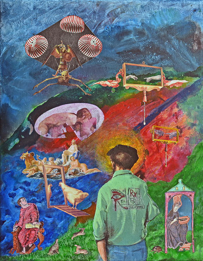 Quite neatly, the turn of the millennium served as a turning point in the work of dear Rx. A turning point in the sense of marking a coming together of previously somewhat disparate conceptual and physical processes into a more or less coherent whole. In the late 1980s and through much of the 1990s, Rx worked to expand their material capabilities with regard primarily to sculpture and printmaking, exploring numerous variations in traditional printmaking techniques as well as executing both personal and commercial 3D sculpture in a variety of media in the form of architectural and scientific models, interior and exterior sculptures, and sculptural structures. During this time, Rx also indulged in their love of collage, executing complex, larger scale mixed media collages and paintings. While they explore a variety of themes, much of the work of that period also concurrently makes connections to historical periods and styles in art, and it is in the intricate and interconnected narratives that emerged in the process of these long works that Rx began to refine the development of their narrative and compositional process.