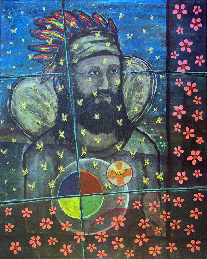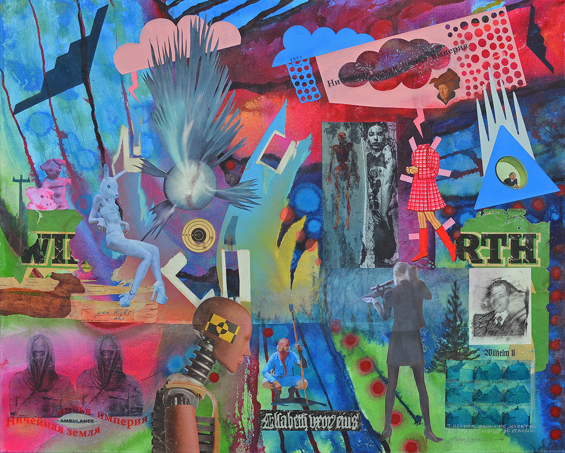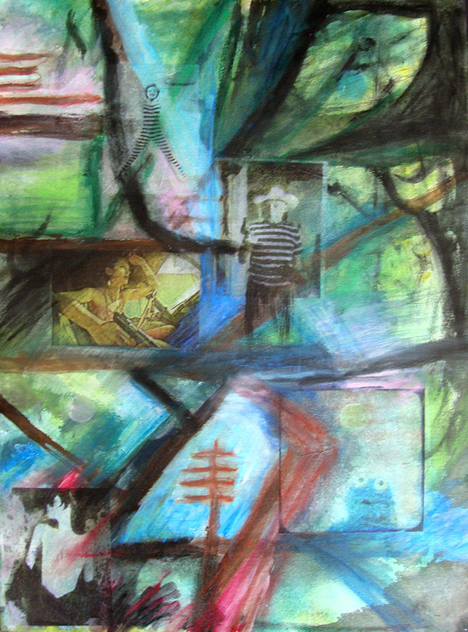 So it is that collage, collaboration, and a desire to avoid predetermination came to produce a shift in the nature of Rx’s art production. Postmodernism cast its obscure shadow across the field lit brightly by Modernism. In 1999 they began a series of mail art engagements with an entity known as Parc Avenue Holdings of Montreal. In the course of this engagement, Rx conceived Taocom Integral as a pseudo institutional entity that comprised the entirety of their varied production – artistic, literary, performative, and everything surrounding it, and subsumed all relative considerations into a holistic process that linked and blurred the lines between fact and fiction. This and several other interactions and collaborations of a performative nature led to a wholesale reconsideration of the creative process in the metaphysical sense. In terms of the material process of visual art making, mixed media exploration was still the primary avenue of approach, and the organisation of that media within an image area - the composition - remained the base upon which concepts could unfold and grow. As material processes and composition are the commonalities of all visual art, the certainty of those fundamental aspects of art allowed Rx to approach the uncertainty, bias, and changing nature of everything intellectual and philosophical with a fluid, evolving, and metaphysical approach to narrative. It was the predetermined narrative that was cast aside in the course of this evolution. The contrived nature of their past methods of narrative development began to give way to divergent processes that served to allow mood, time, coincidence, history, and a host of other variables contribute to the development of narratives simultaneous to, and even after the development of the physical composition, rather than prior to. That notion aids in succinctly summing up the basic nature of the adjustment to Rx’s process. Works may begin with a vague notion of a theme or simply a particular mood or feeling rather than an intellectual idea developed and rendered as a visual narrative – as had generally been their process in the past. The unformed idea is given its nascent visual manifestation in a material process – most recently this takes the form of mixed media painting that is best described in its initial stages as a non-objective abstract composition. From that initial composition a sense of space and of mood is developed, and then the collage and refinement processes come into play and the narrative grows out of the many conceptions and relationships that are observed or arise during the process of collection and consideration of elements. This process has been enriched over time by the natural development of a complex and growing image repertoire, which called into play over the course of multiple works and years, constitutes the organic development of an individualized semiotic system.