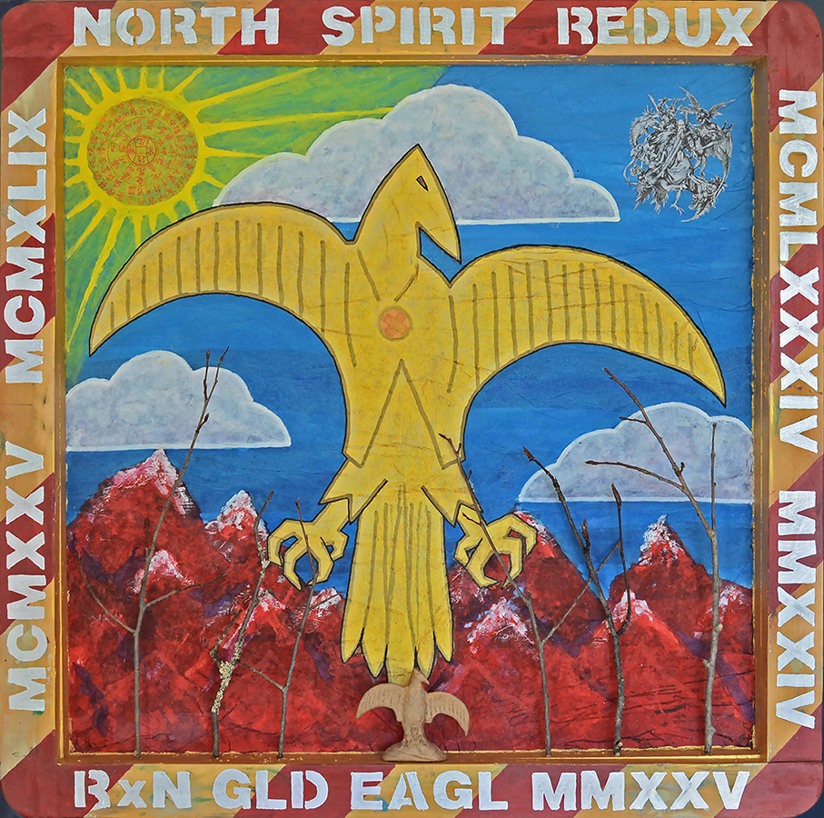 "The Gold Eagle" - is a hotel and bar on McKenzie Island in Red Lake, and the focal artefact of the Red Lake Gold project from its inception - the Eagle idol, not the hotel, though it too was iconic. North Spirit Lake is a Reserve North of Red Lake where I lived for about a year in 1983, and which connects with numerous aspects of the Red Lake Gold Project. Essentially, the seed for this entire endeavour was a few ounces of semi smelted gold from Red Lake which came into my father’s possession via his high grading brother sometime in the late 1940s, to the best of my knowledge. I had mused on the idea of creating a sculpture or two with the gold since I was a student, but I didn’t get any sufficiently satisfying idea for it conceptually until I linked it to my Goldmouth (Fable for Albert) lithograph and several other Red Lake based projects after completing the original RLG collage. In addition to the first Gold Eagle sculpture, I executed a second to mount in the inset frame of North Spirit Redux. It differs from the version on The Great Cuckoo sculpture in that its an approximation of the Redux thumbnail version - and does a better job of capturing the form than the painting does.