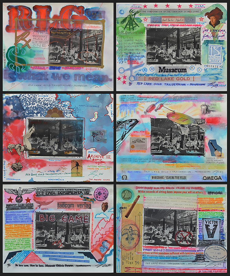 Documentation Order/Reorder. As my progression through the planned stages of the Red Lake Gold project has evolved over the past five years or so, both the documentation and fundamental elements/artefacts have expanded…. How I elucidate this here has challenged me as well, as the overview of the project objectives and developments run backwards, if you will, and spread over the different sections of this website. Most of the developments are touched upon in part in this Mixed Media section, and expanded upon in other sections relative to sculptural elements, printmaking elements, and in the main RLG document itself, which has not had any additional pages developed in 2025, as my documentation of my attempts to evolve both new and old components took the form of printmaking related series’ and mixed media works on paper - which I progressed through as I avoided beginning the planned video and other media projects related to the broader meta project.