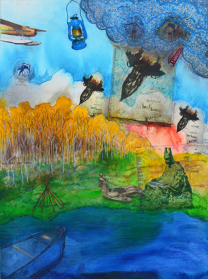 "Dominion Bridge" is the second mixed media study for the Red Lake Gold Merz project. MERZ being the meta project, if you will. That is elaborated upon, if not elucidated in the RLG Documenta. This piece draws heavily on past compositional modes and media usage, as well as my historical image repertoire to broach notions of land and landscape, colonialism, opression, genocide, globalism vs. regionalism… histories, fabrications, and so forth. These are examined relative to ruminations considering one's personal history (and culpability) relative to those and so very many other connections that have come into play in the wider project.