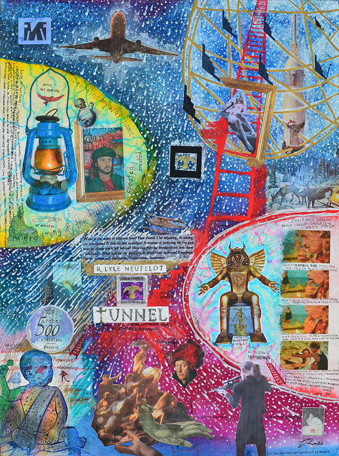 Found and Lost ‘86 was the third of my “test collages” as I had discounted “Dominion Bridge” as a test collage by the time I began “86”. As the title suggests, this piece goes back to my artistic beginnings, and explores the period of my initial development from my student years on through the mid 90s, once again connecting to RLG themes over its long working period. It was developed sporadically as I worked on finishing the final of the trio of sculptures that occupied me over most of 2024. “86” includes a self portrait from that year, done in a typical student last minute crunch, with wishy washy all nighter rendering. The final piece kind of nauseates me in its retro-ness - so, I was successful then in capturing a conglomeration of my approaches from that period, but it makes me want to now destroy and rework it into something new. I'll put it in a closet and let it alone though, as along with the sculptures, it closes this phase of the RLG project, and is just what it needed to be.