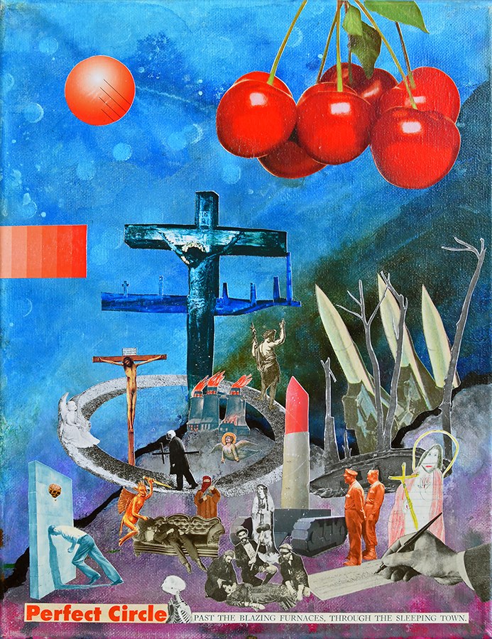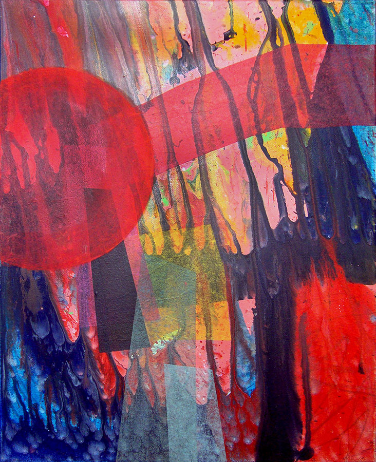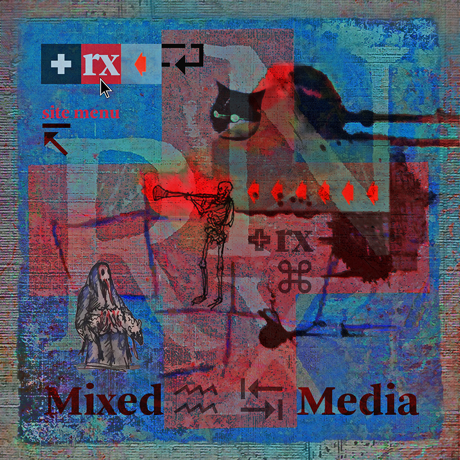 So it is that collage, collaboration, and a desire to avoid predetermination came to produce a shift in the nature of Rx’s art production. Postmodernism cast its obscure shadow across the field lit brightly by Modernism. In 1999 they began a series of mail art engagements with an entity known as Parc Avenue Holdings of Montreal. In the course of this engagement, Rx conceived Taocom Integral as a pseudo institutional entity that comprised the entirety of their varied production – artistic, literary, performative, and everything surrounding it, and subsumed all relative considerations into a holistic process that linked and blurred the lines between fact and fiction. This and several other interactions and collaborations of a performative nature led to a wholesale reconsideration of the creative process in the metaphysical sense. In terms of the material process of visual art making, mixed media exploration was still the primary avenue of approach, and the organisation of that media within an image area - the composition - remained the base upon which concepts could unfold and grow. As material processes and composition are the commonalities of all visual art, the certainty of those fundamental aspects of art allowed Rx to approach the uncertainty, bias, and changing nature of everything intellectual and philosophical with a fluid, evolving, and metaphysical approach to narrative. It was the predetermined narrative that was cast aside in the course of this evolution. The contrived nature of their past methods of narrative development began to give way to divergent processes that served to allow mood, time, coincidence, history, and a host of other variables contribute to the development of narratives simultaneous to, and even after the development of the physical composition, rather than prior to. That notion aids in succinctly summing up the basic nature of the adjustment to Rx’s process. Works may begin with a vague notion of a theme or simply a particular mood or feeling rather than an intellectual idea developed and rendered as a visual narrative – as had generally been their process in the past. The unformed idea is given its nascent visual manifestation in a material process – most recently this takes the form of mixed media painting that is best described in its initial stages as a non-objective abstract composition. From that initial composition a sense of space and of mood is developed, and then the collage and refinement processes come into play and the narrative grows out of the many conceptions and relationships that are observed or arise during the process of collection and consideration of elements. This process has been enriched over time by the natural development of a complex and growing image repertoire, which called into play over the course of multiple works and years, constitutes the organic development of an individualized semiotic system.