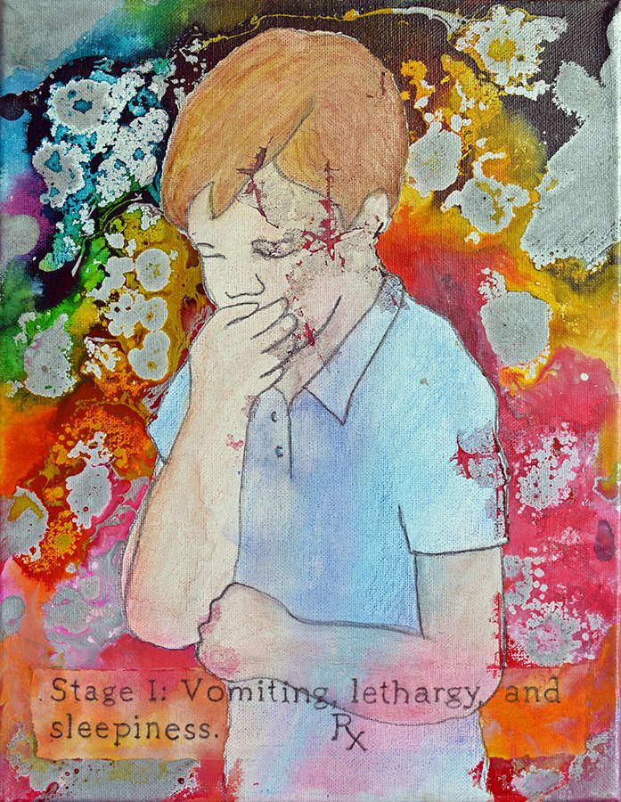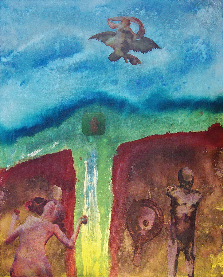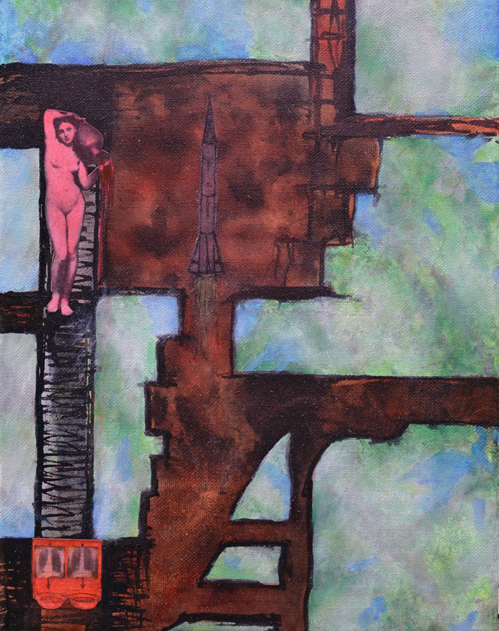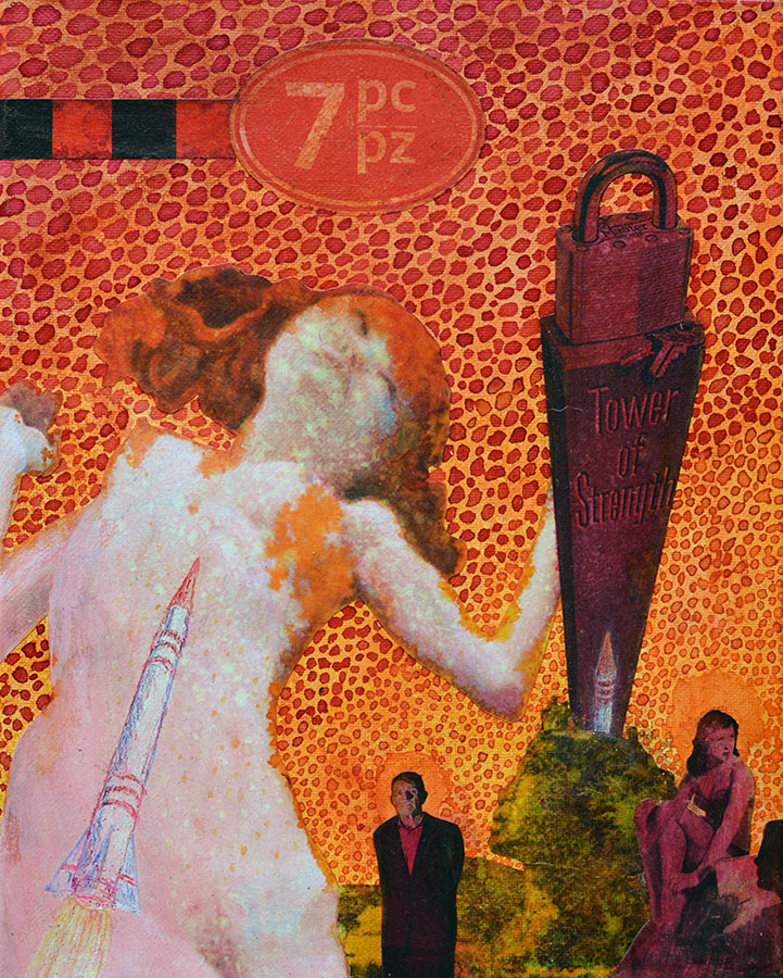 Quite neatly, the turn of the millennium served as a turning point in the work of dear Rx. A turning point in the sense of marking a coming together of previously somewhat disparate conceptual and physical processes into a more or less coherent whole. In the late 1980s and through much of the 1990s, Rx worked to expand their material capabilities with regard primarily to sculpture and printmaking, exploring numerous variations in traditional printmaking techniques as well as executing both personal and commercial 3D sculpture in a variety of media in the form of architectural and scientific models, interior and exterior sculptures, and sculptural structures. During this time, Rx also indulged in their love of collage, executing complex, larger scale mixed media collages and paintings. While they explore a variety of themes, much of the work of that period also concurrently makes connections to historical periods and styles in art, and it is in the intricate and interconnected narratives that emerged in the process of these long works that Rx began to refine the development of their narrative and compositional process.