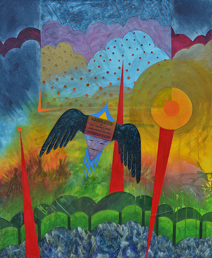 And so, with the completion of the Tunnel book in 2002, and the subsequent completion of the third and final original triptych panel as “Picture Haven” in 2007, along with the numerous interactions in between, Rx completed that stage of their transformation of style and intent, and this is reflected in their work of the subsequent decade. Currently, they have endeavoured to find the time and interest to engage in various printmaking techniques again. They also returned to and completed a large collage based mixed media work that is composed on one of two structures built in 1999. The first was completed as “Poem of the Sky” in 1999, and was entirely collage based. It was intended that the second structure be completed as a companion to the first, but it stayed on the periphery as Tunnel developed, hanging blank on the studio wall, considered from time to time, ultimately taking 18 years to return to. For years it had the working title “Poem of the Cloud” but upon completion was titled “The Sky Fall”. It is another visual documental consideration of Rx’s transition of approach over time, a summation of a sort, but also indicative of new transitions coming into play yet again.